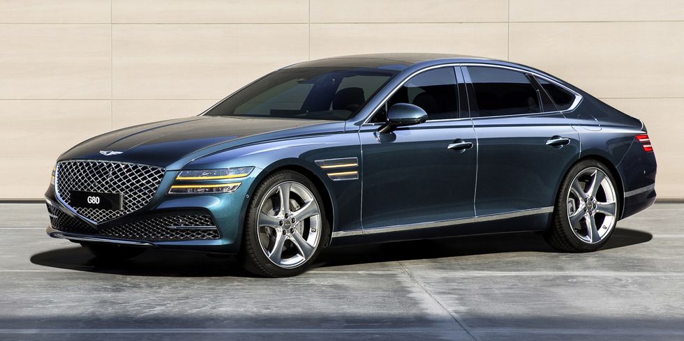 The G80’s looks are pure Genesis. It uses the same upside-down pentagon grille and quad-rectangle headlight design as the company’s GV80 SUV. It’s no coincidence the two cars also share the same platform. The car is 249 pounds lighter than before thanks to use of aluminum in the chassis, and comes with a choice of two turbocharged engines: a base 2.5-liter inline-four making 300 horsepower and 311 lb-ft of torque, and an optional twin-turbo 3.3-liter V-6 making 375 horsepower and 291 lb-ft of torque. Overseas, a 2.2-liter turbodiesel inline-four making 210 horsepower and 325 lb-ft of torque will also be available. Sadly, the 5.0-liter V-8 from the last-gen car is no longer an option. Both engine trims coming to the U.S. will send power to the rear wheels via an eight-speed automatic transmission, and can be equipped with all-wheel drive.